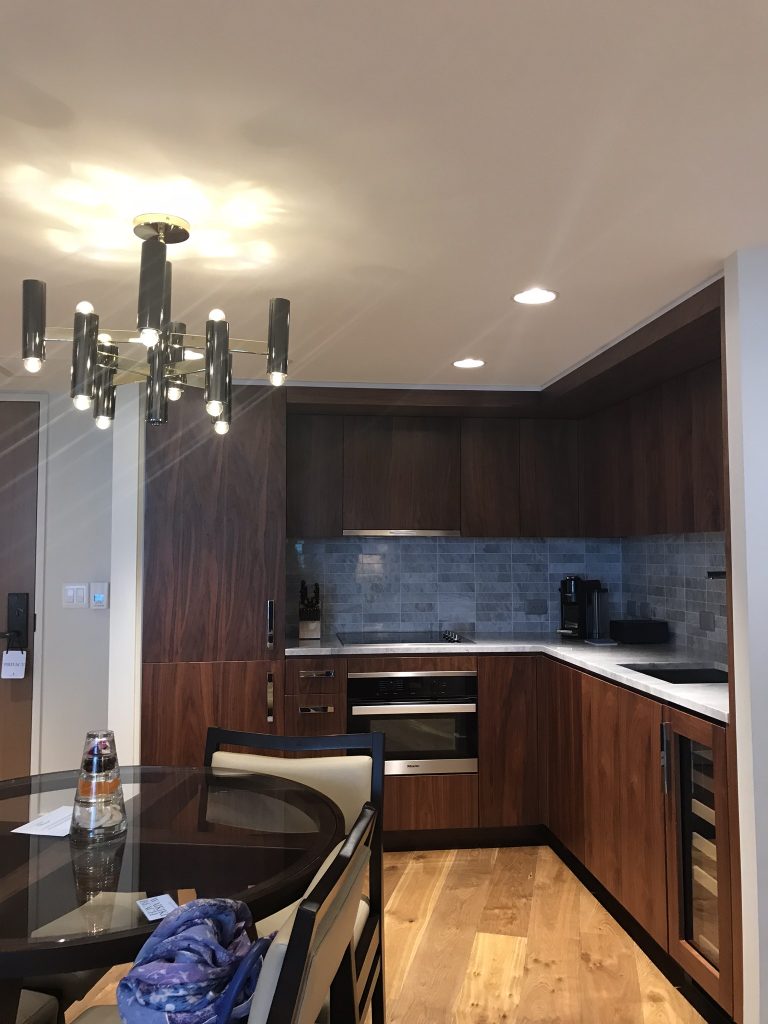 節入りの味わいのあるフローリングは、世界中のトレンドなのですね。サイドテーブルはオークの木目に白い塗料を入れたうづくり風。キッチン扉や室内ドアの面材は突き板です。天然木が使われた空間は落ち着きと上質感が漂います。日本の場合、高価なマンションでも、なんだかインテリアの上質感が足りないなと思う時は、たいていシート貼りの床やドアであることが多いですね。これはとても残念です。